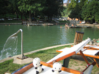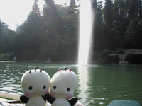 テコポンとデコポンは、ガルダ湖の近くに行きました。 ここは、テルマーレという温泉の湖があります。 「きゃぁー、お兄ちゃん、あれは何??」 後ろで勢いよく吹き上げている水にびっくりした二人。 「あれは、温泉なんだよ。お肌がすべすべになるんだって。」 とかめさんが教えてくれました。 「へぇ。そうなの?そういえば、みんな入っているよ。気持ちよさそうだね。」 「お兄ちゃん!あたしもお肌すべすべになりたい!!入ろう!!」 と好奇心旺盛なテコポンは、あっという間に温泉に飛び込んでしまいました。 「待って〜、僕も行くよ!」 続いてデコポンが飛び込みました。 「気持ちいいね〜・・・。」 二人はしばらく温かい温泉につかり、お肌すべすべ、ぽかぽかになりました。 つづく・・・