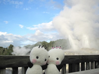 次の日、テコポンとデコポンが歩いていると、 遠くに何かが吹き上げている所が見えました。 「あれ?なんだろう。行ってみよう!!」 テコポンとデコポンがワクワクしながら近づいていくと、 急に「シュー!!シュー!!」 と熱いお湯みたいなものが吹き上げました。 「ギャ―!!なにこれ?!」 テコポンもデコポンもびっくりして飛び上がりました。 「テコポン、デコポン、すごいでしょう!!これは、間欠泉というんだよ。ニュージーランドでは温泉がわくから、熱湯を吹き上げるんだ。熱いから気をつけてね!」 近くを飛んでいた鳥さんが教えてくれました。 「わぁぁ、自然の力って本当にすごいんだね。」 テコポンとデコポンは改めて自然のパワーにびっくりしました。 つづく・・・